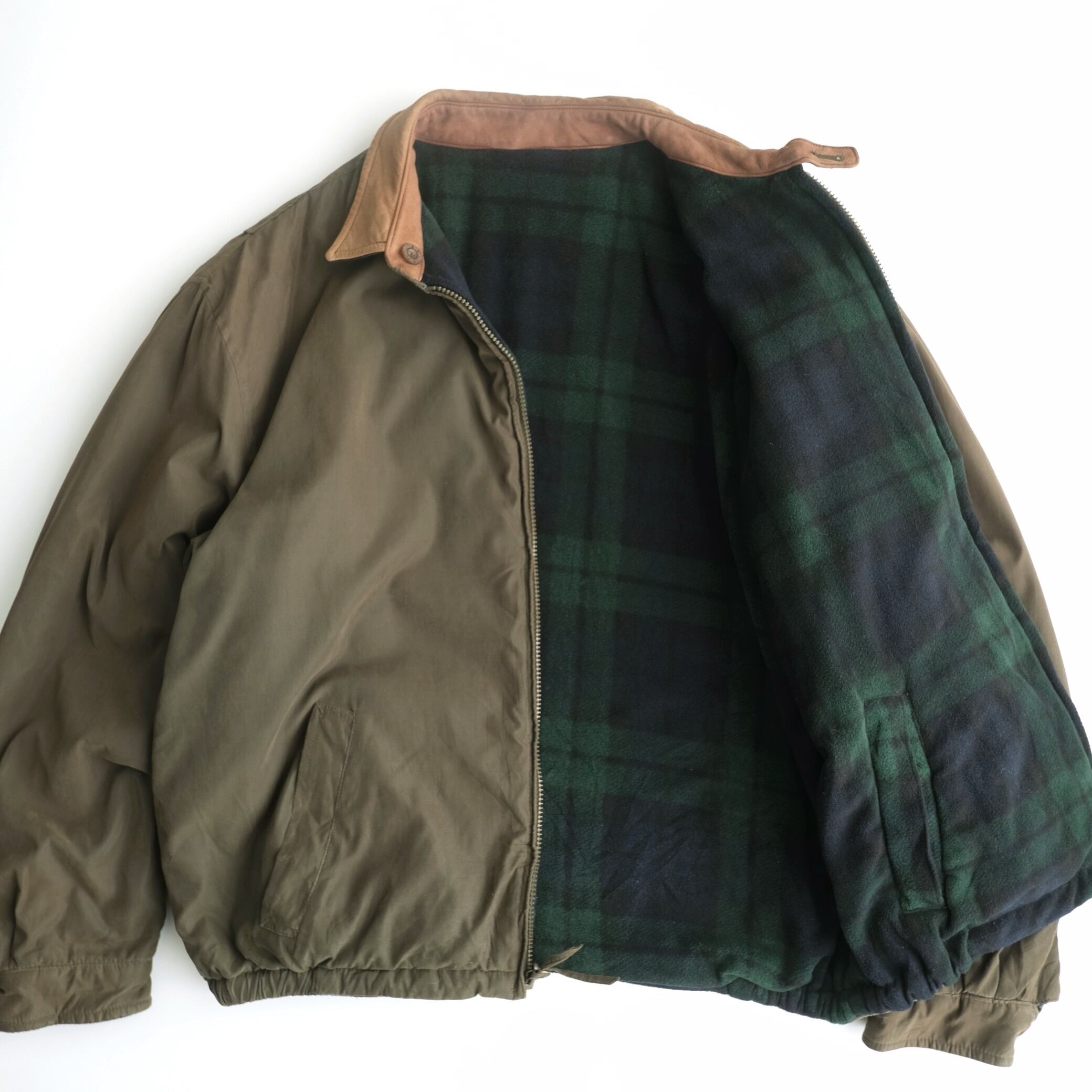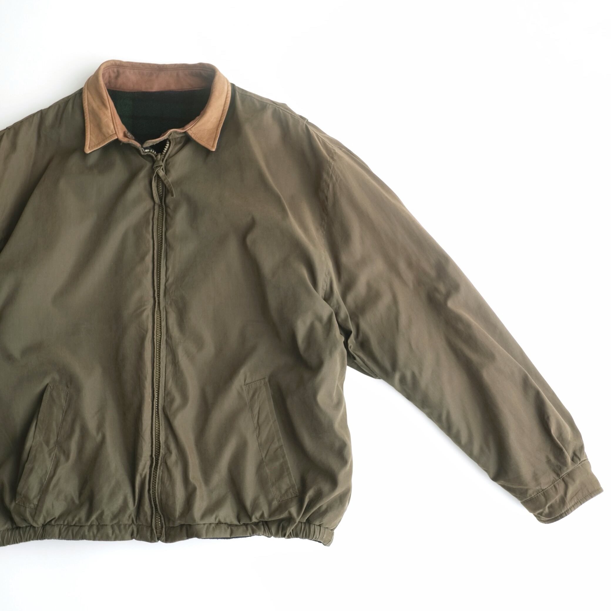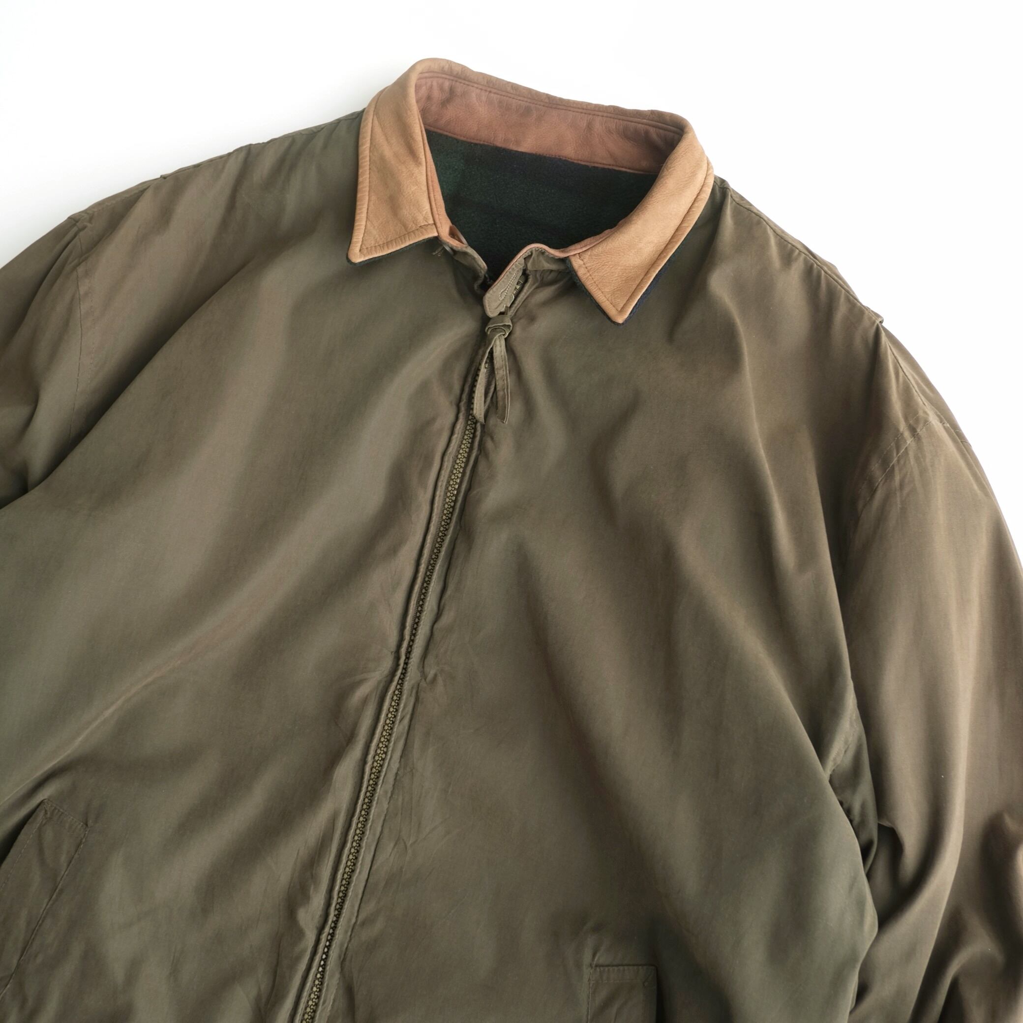 表面はオリーブカラーのナイロン系ファブリックに、襟はレザー切替仕様。