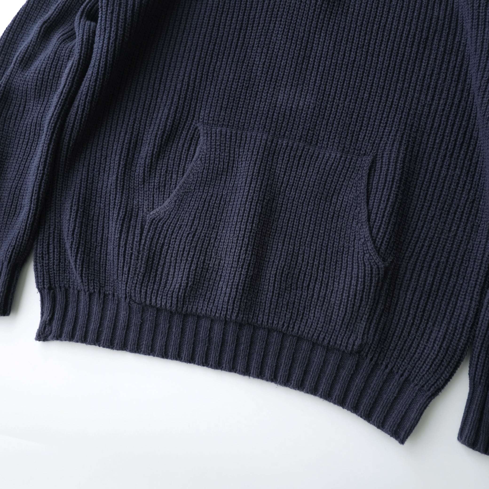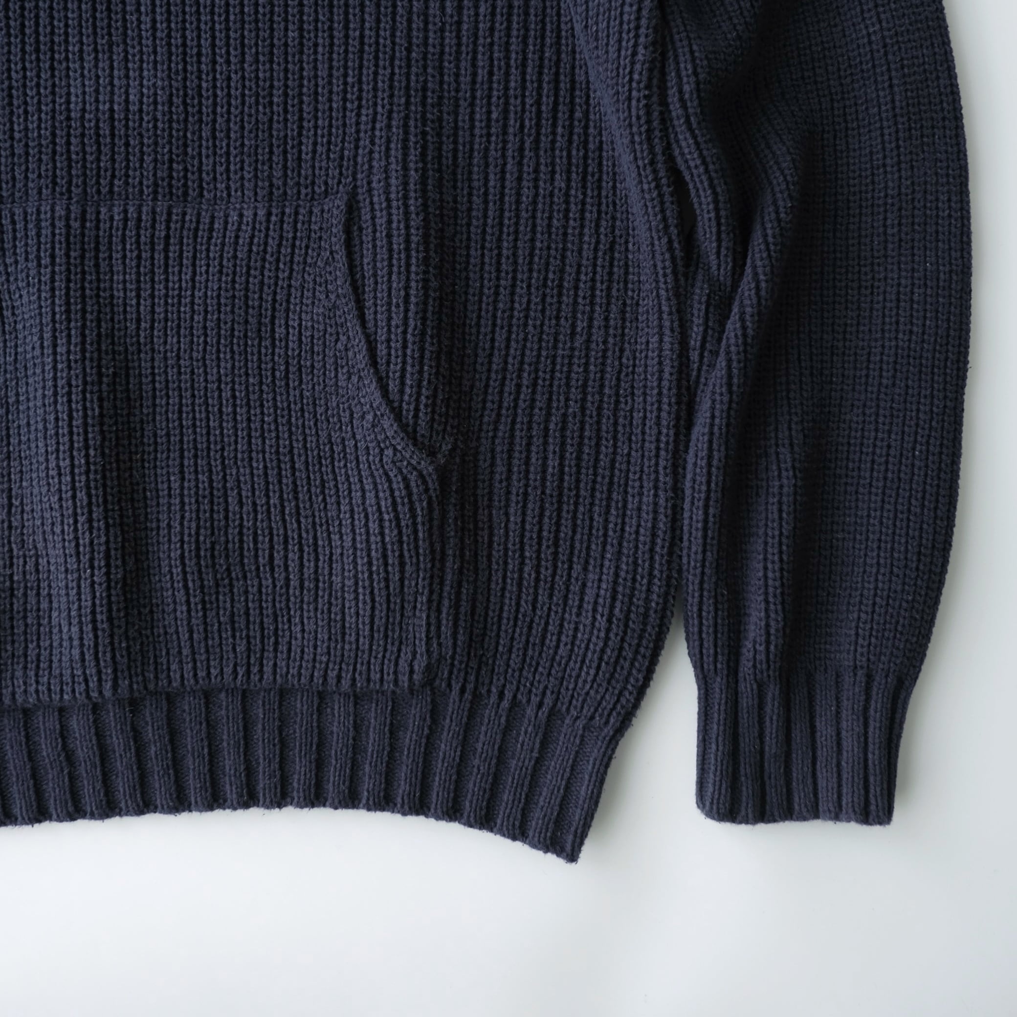 フロントにはカンガルーポケットを配し、ニットでありながらもスポーティな要素を感じる一着です。