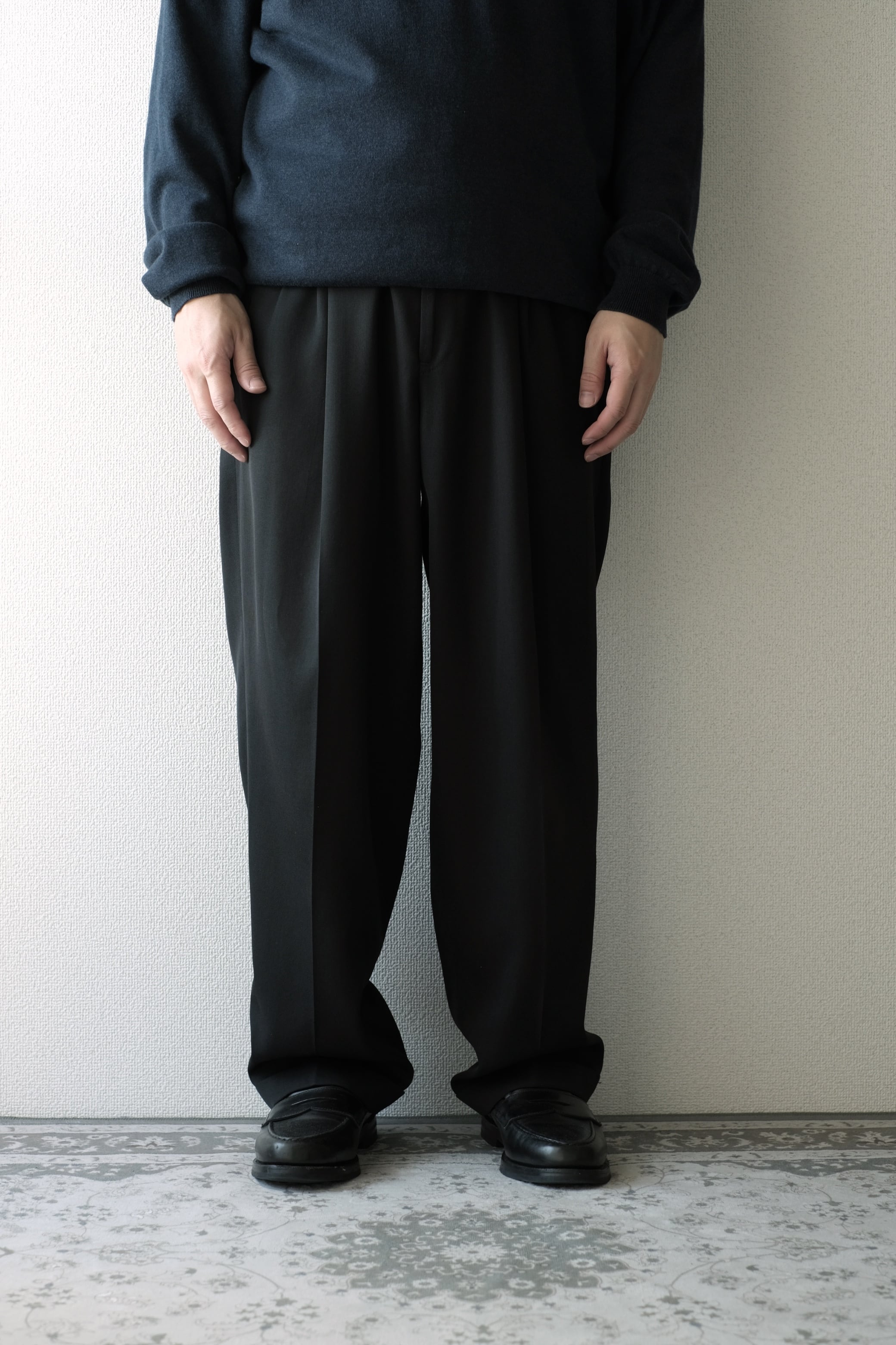 スリータックによるゆとりのある腰回りから、緩やかにテーパードしたシルエット。